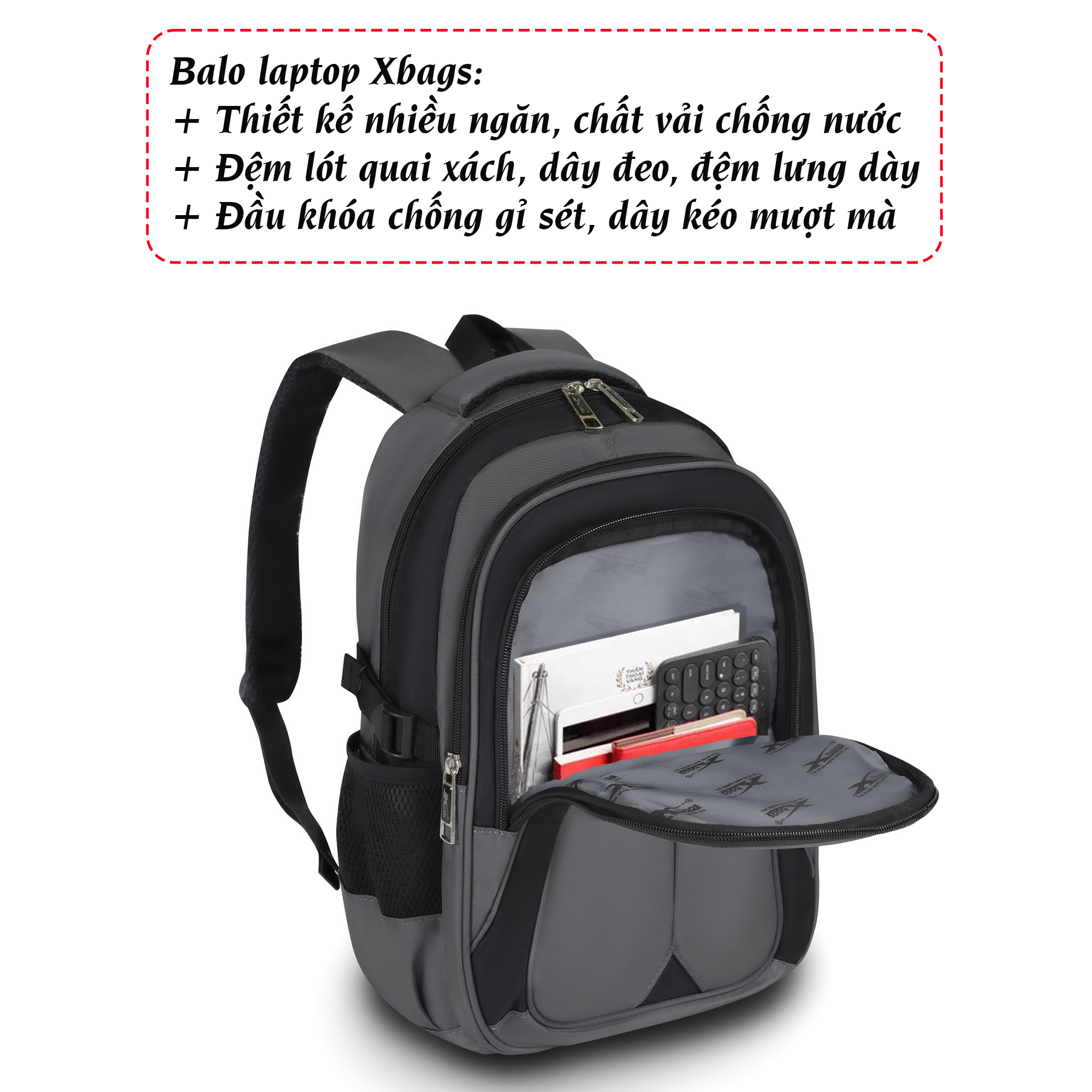 Balo nam đựng laptop XBags có 2 ngăn chính và nhiều ngăn phụ, túi nhỏ khác nhau rất tiện dụng để các vật dụng khác như sách vở, dụng cụ học tập, chìa khóa, ipad,.. rất tiện lợi.