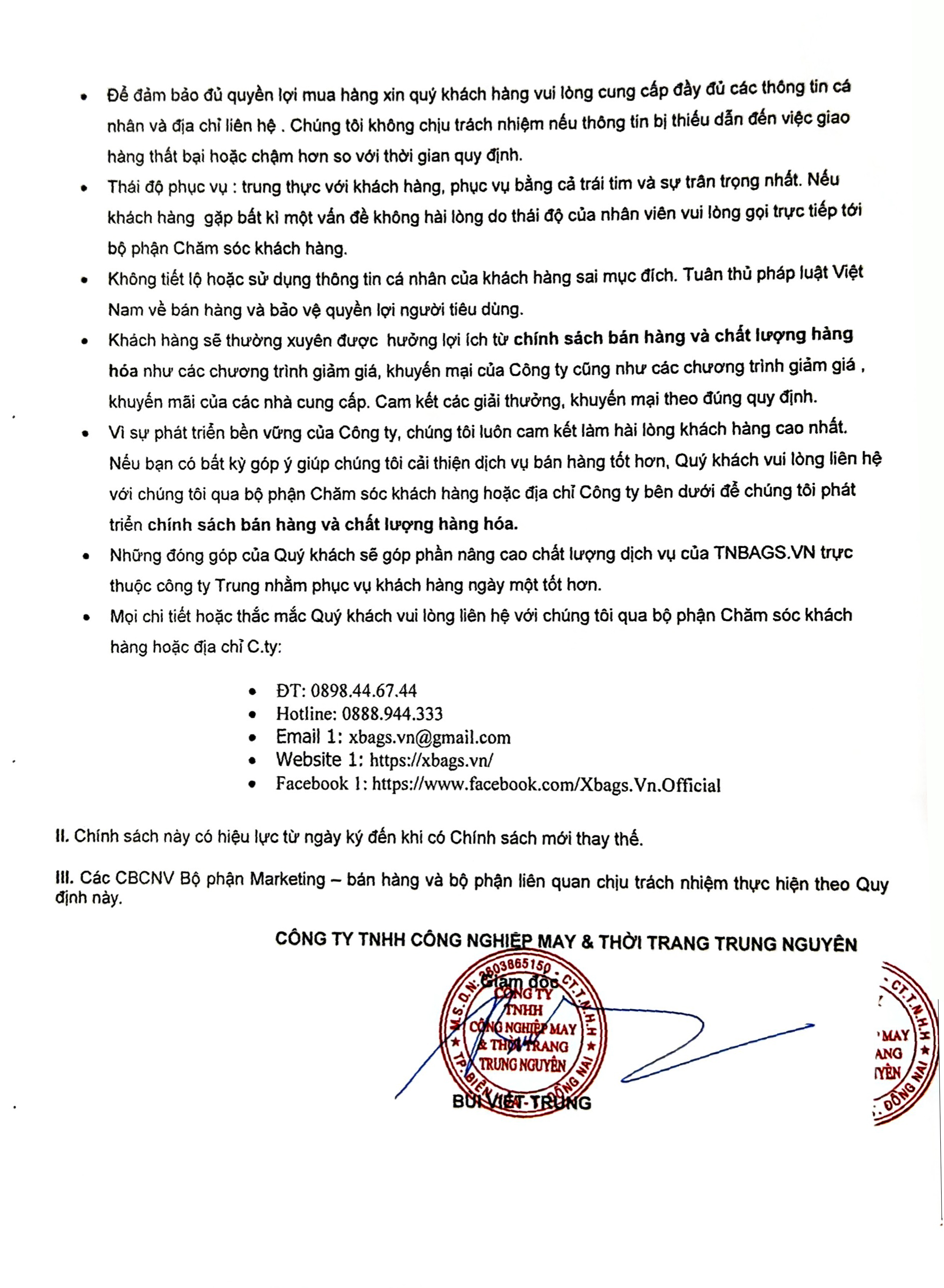 - Không tiết lộ hoặc sử dụng thông tin cá nhân của khách hàng sai mục đích. Tuân thủ pháp luật Việt Nam về bán hàng và bảo vệ quyền lợi người tiêu dùng.