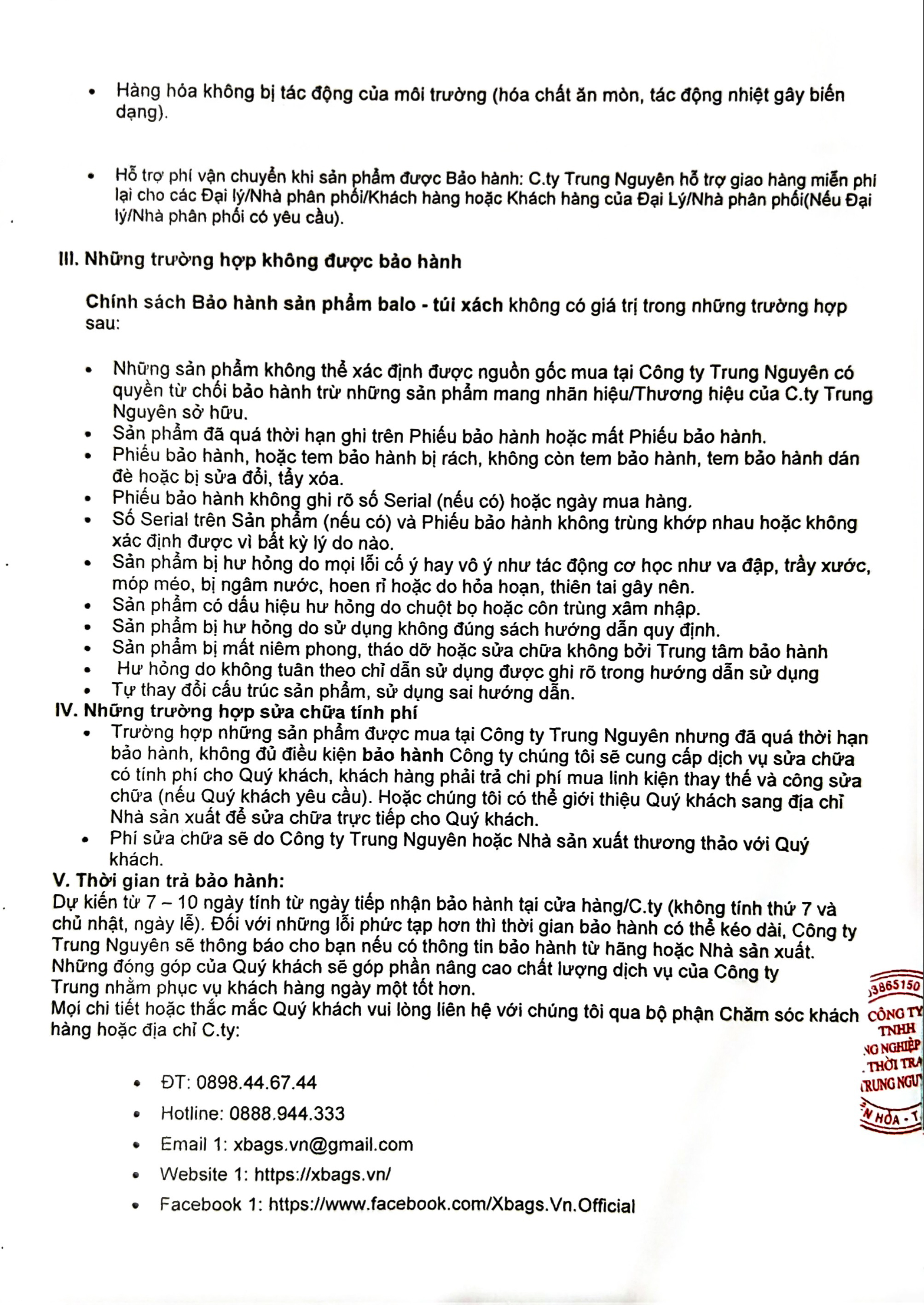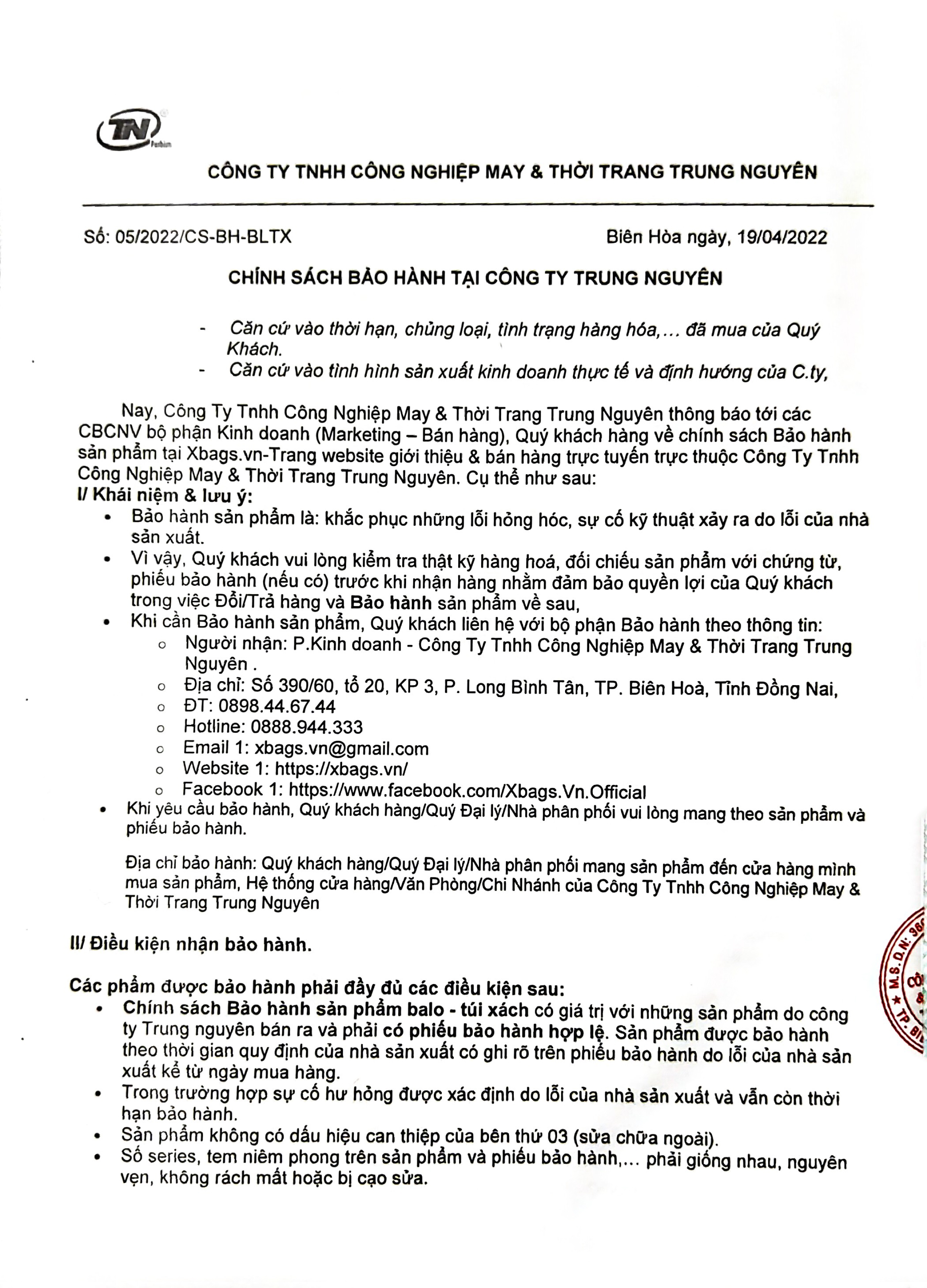 Công Ty TNHHThiết Bị Văn Phòng Trường Học Trung Nguyên thông báo tới các CBCNV bộ phận Kinh doanh (Marketing – Bán hàng), Quý khách hàng về chính sách Bảo hành sản phẩm tại tnshop.com.vn & Các hệ thống bán hàng balo - túi xách trực thuộc công ty Trung Nguyên. Cụ thể như sau: