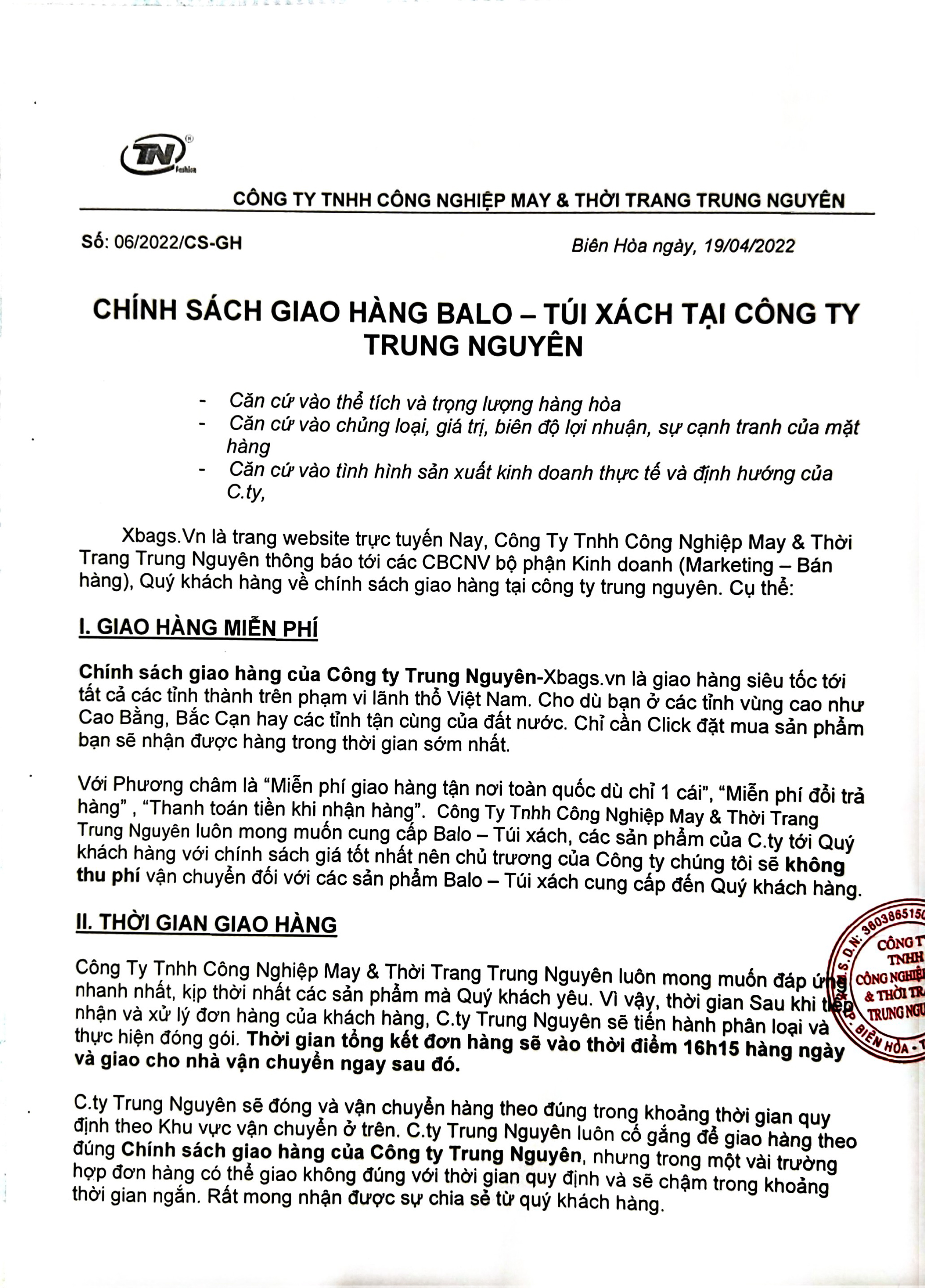 Với Phương châm là ” Miễn phí giao hàng tận nơi toàn quốc dù chỉ 1 cái”, “ Miễn phí đổi trả hàng” , “ thanh toán tiền khi nhận hàng”. Công Ty Tnhh Công Nghiệp May & Thời Trang Trung Nguyên luôn mong muốn cung cấp Balo – Túi xách, các sản phẩm của C.ty tới Quý khách hàng với chính sách giá tốt nhất nên chủ trương của Công ty chúng tôi sẽ không thu phí vận chuyển đối với các sản phẩm Balo – Túi xách cung cấp đến Quý khách hàng.