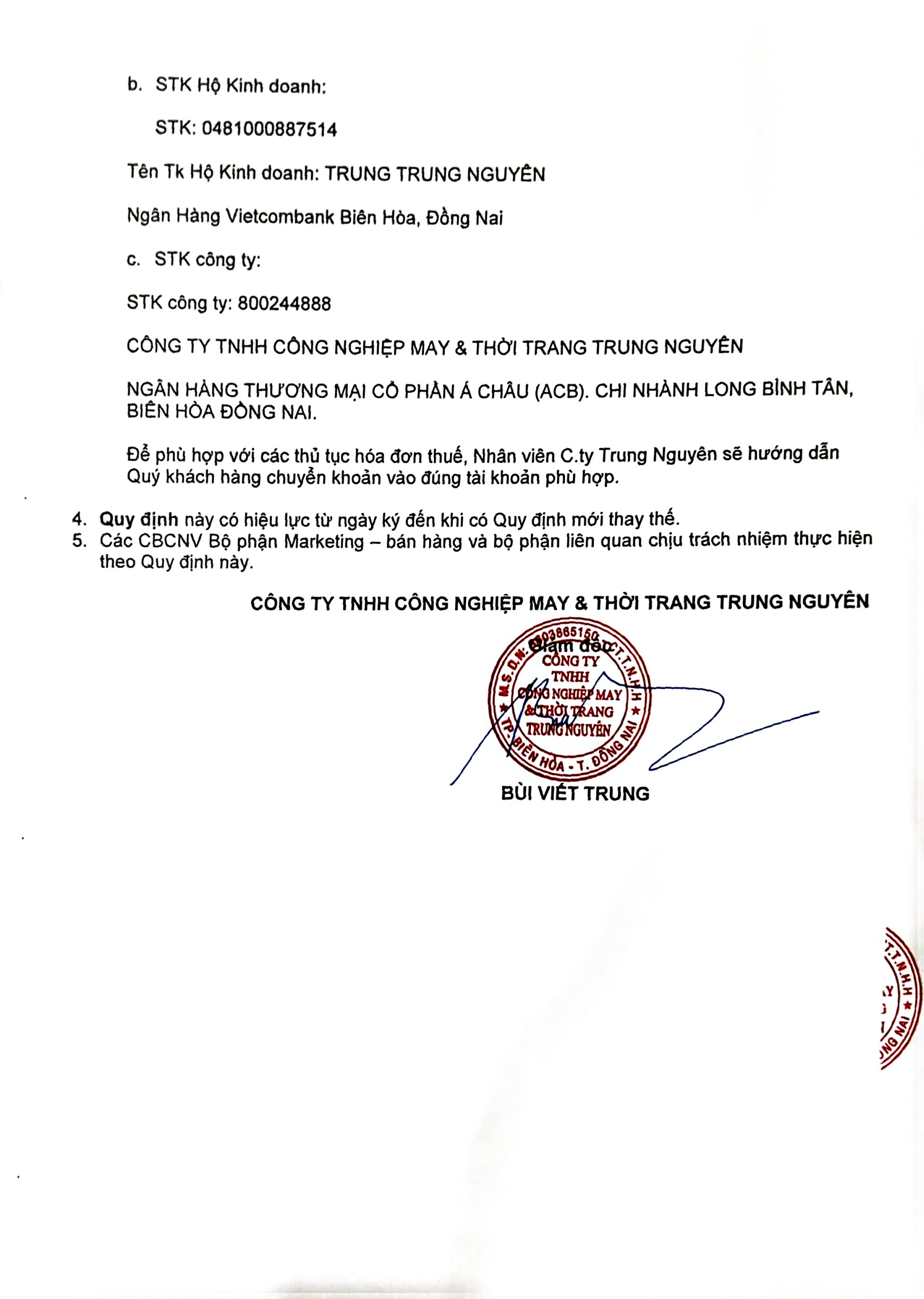 Quý khách thanh toán chuyển khoản trước vào tài khoản cá nhân hoặc công ty, Công Ty Tnhh Công Nghiệp May & Thời Trang Trung Nguyên sẽ tiến hành giao hàng cho Quý khách.