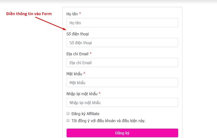 B2: Nhập thông tin chính xác vào form đăng ký, click chọn ô chấp nhận điều khoản rồi chọn Đăng ký.