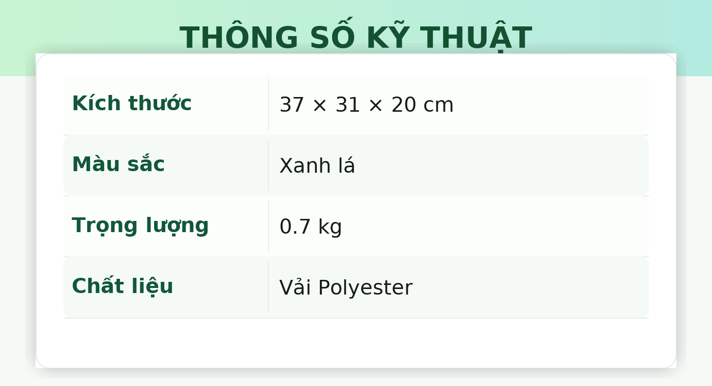Sản phẩm có kích thước chuẩn 37 x 31 x 20cm, được thiết kế tổ chức ngăn đựng một cách khoa học với ngăn chính rộng rãi và nhiều ngăn phụ. Bé có thể đựng sách vở, dụng cụ học tập, quần áo, vật dụng cá nhân thoải mái để phục vụ cho việc học hay sử dụng để đi cắm trại, dã ngoại, tham gia các hoạt động ngoài trời, hội thao,...