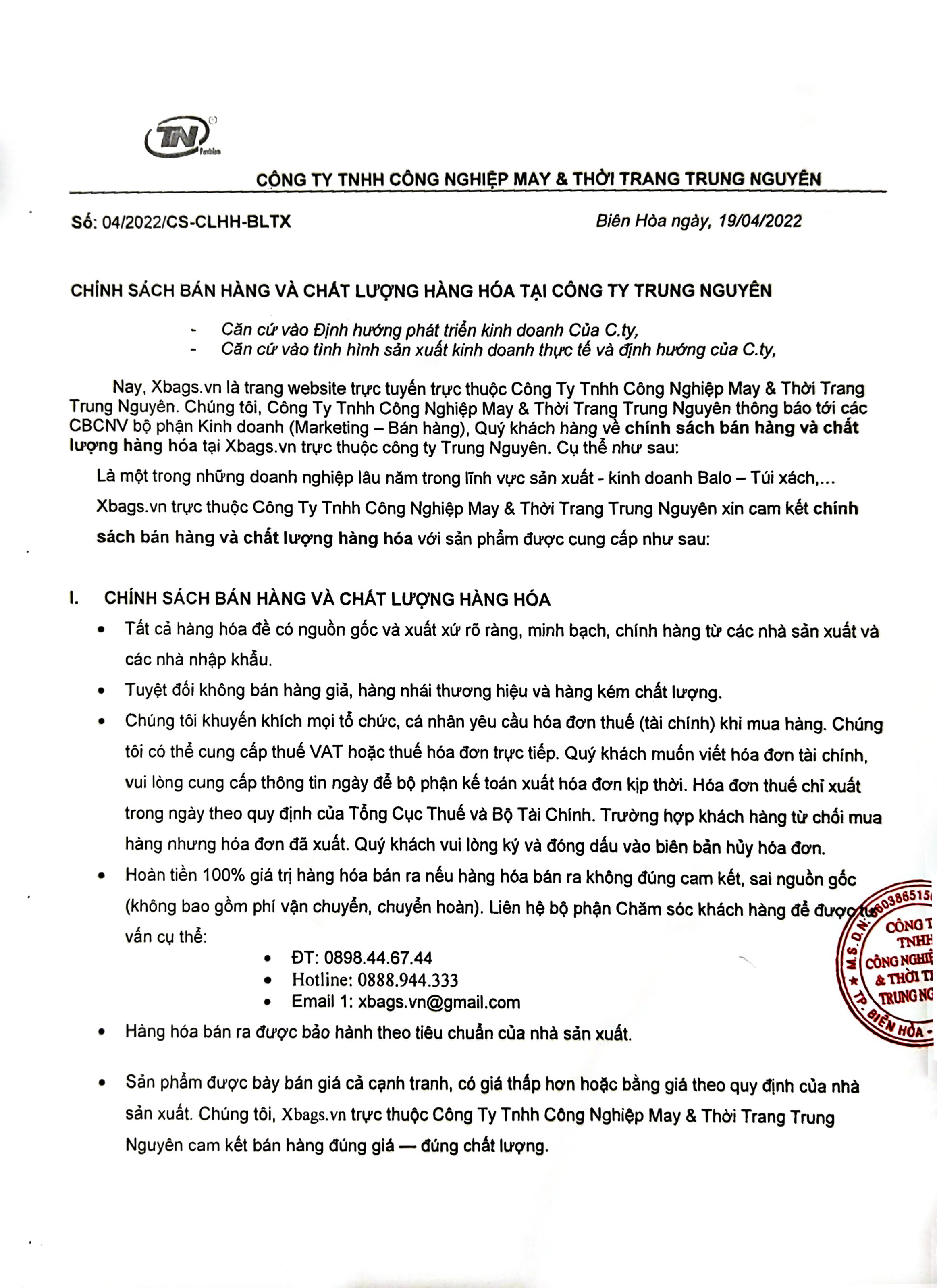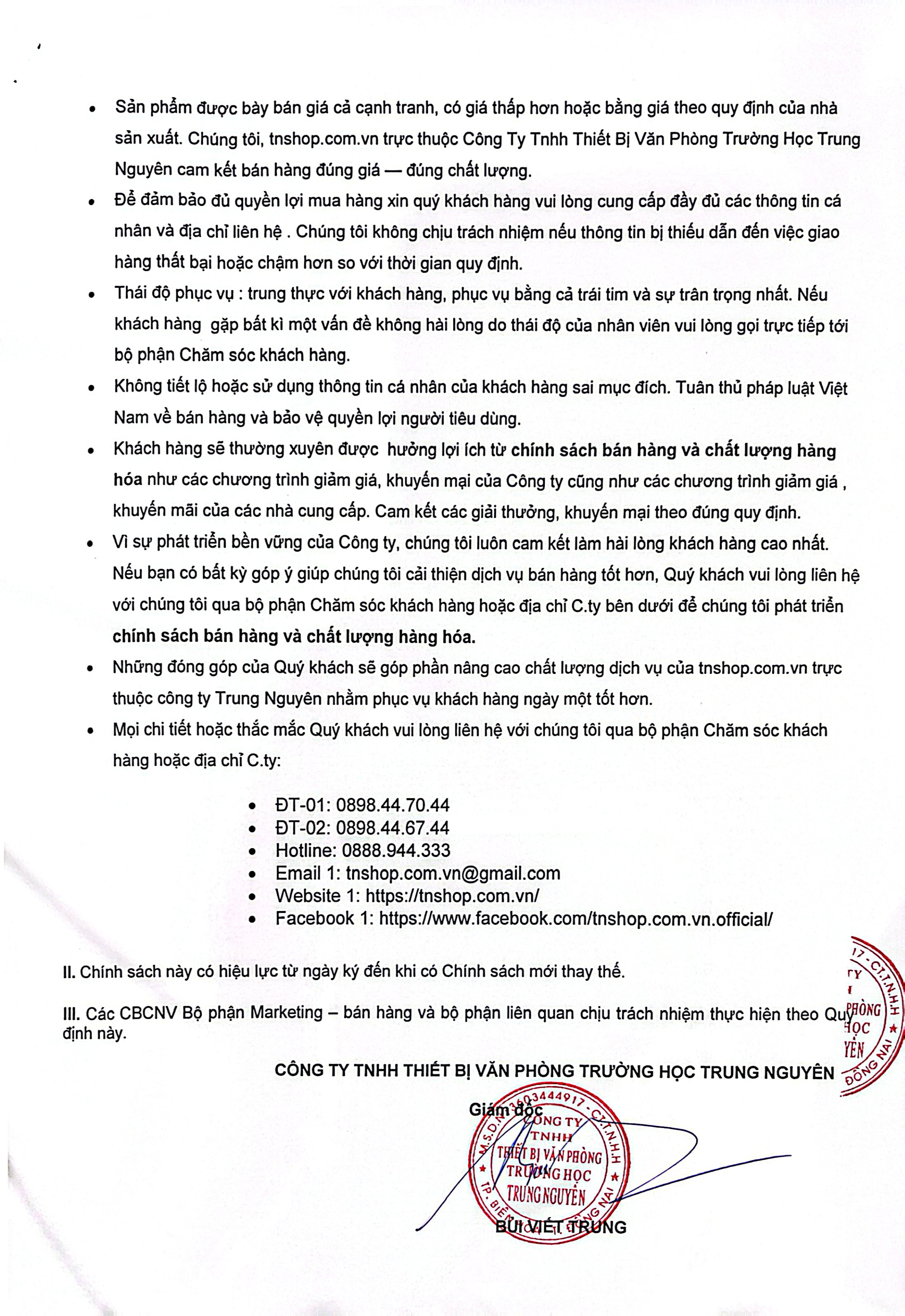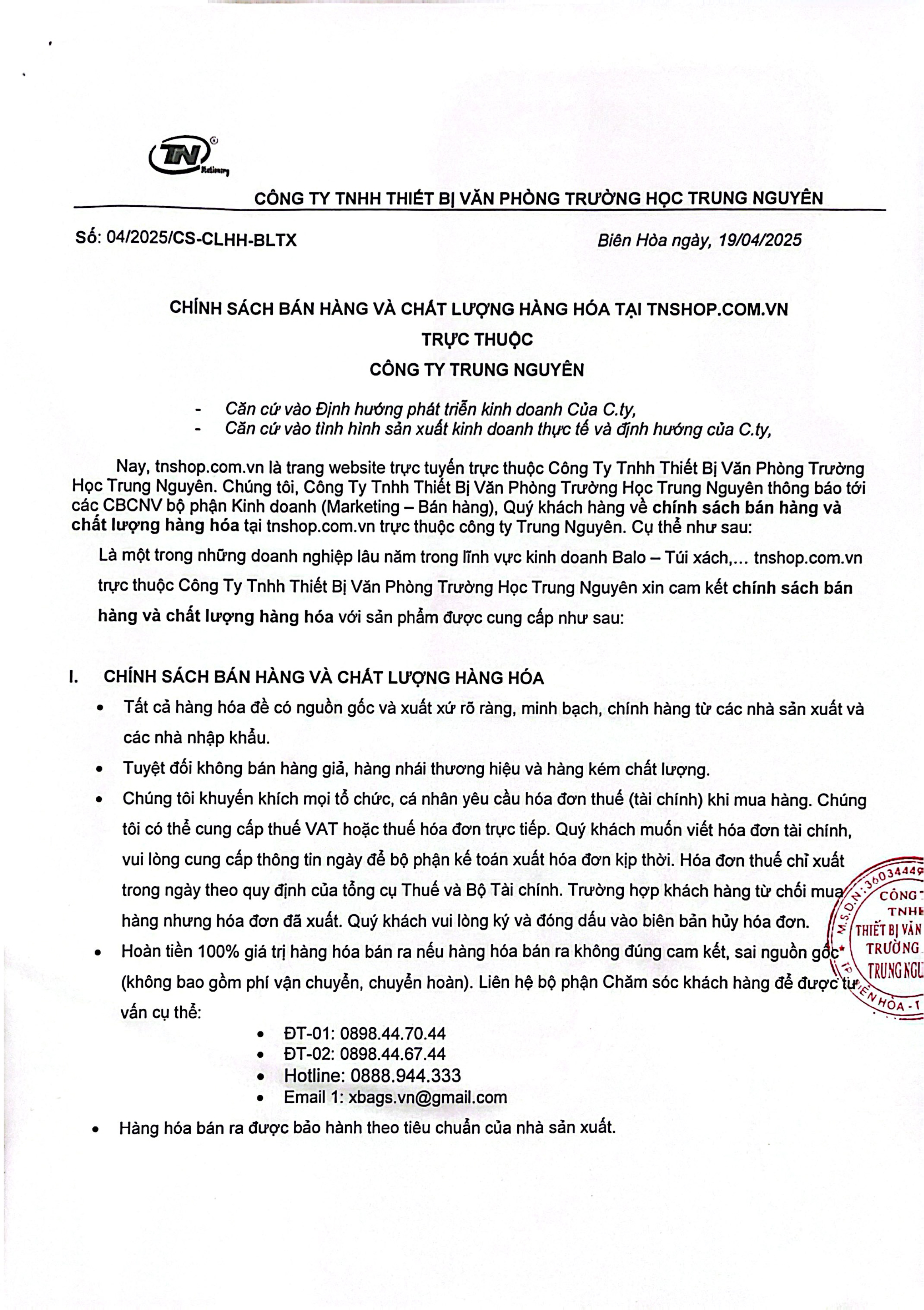 tnshop.com.vn trực thuộc Công Ty Tnhh Thiết Bị Văn Phòng Trường Học Trung Nguyên thông báo tới các CBCNV bộ phận Kinh doanh (Marketing – Bán hàng), Quý khách hàng về chính sách bán hàng và chất lượng hàng hóa tại tnshop.com.vm trực thuộc Công ty Trung Nguyên. Cụ thể như sau: