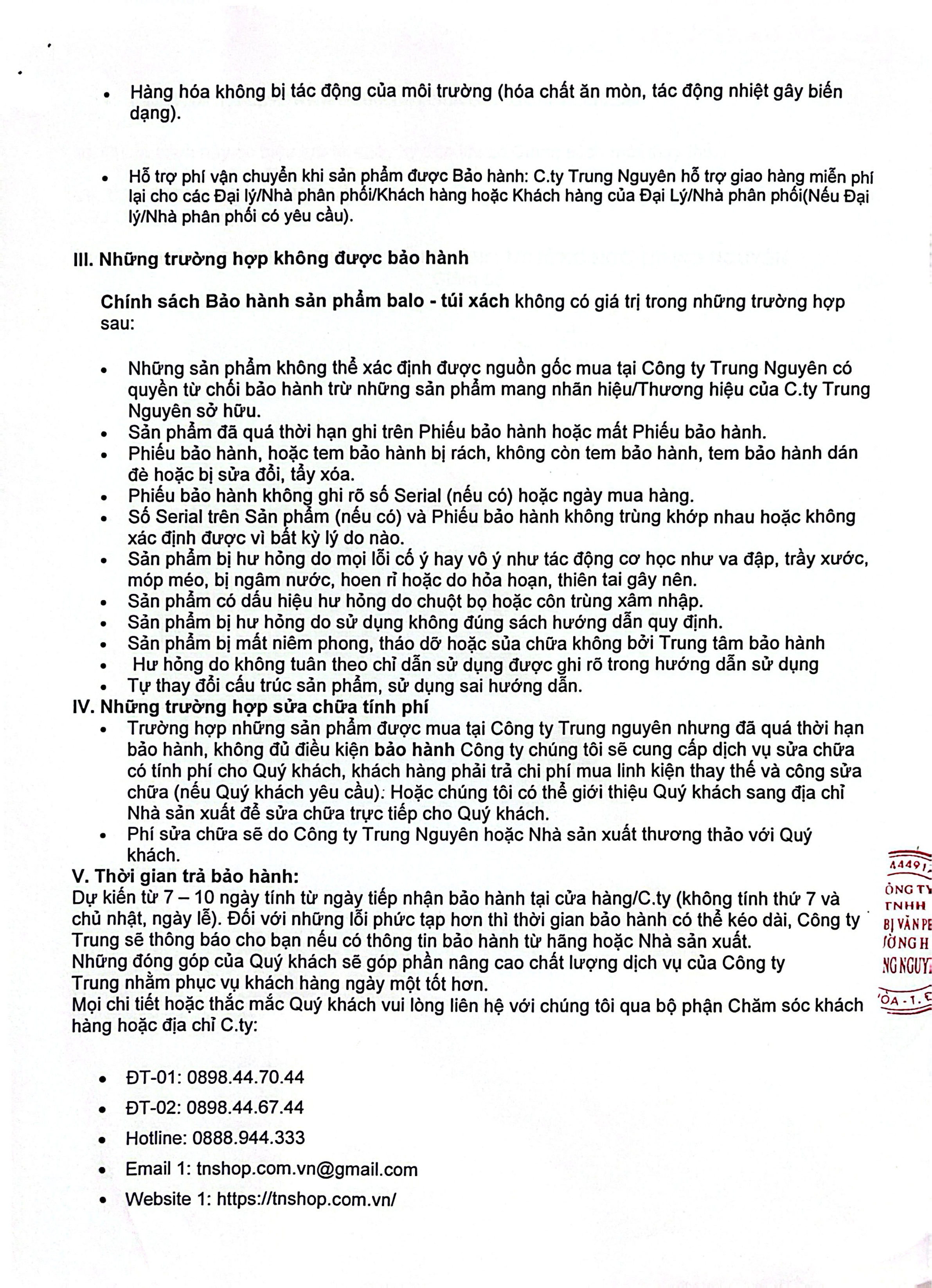 Công Ty TNHHThiết Bị Văn Phòng Trường Học Trung Nguyên thông báo tới các CBCNV bộ phận Kinh doanh (Marketing – Bán hàng), Quý khách hàng về chính sách Bảo hành sản phẩm tại tnshop.com.vn & Các hệ thống bán hàng balo - túi xách trực thuộc công ty Trung Nguyên. Cụ thể như sau: