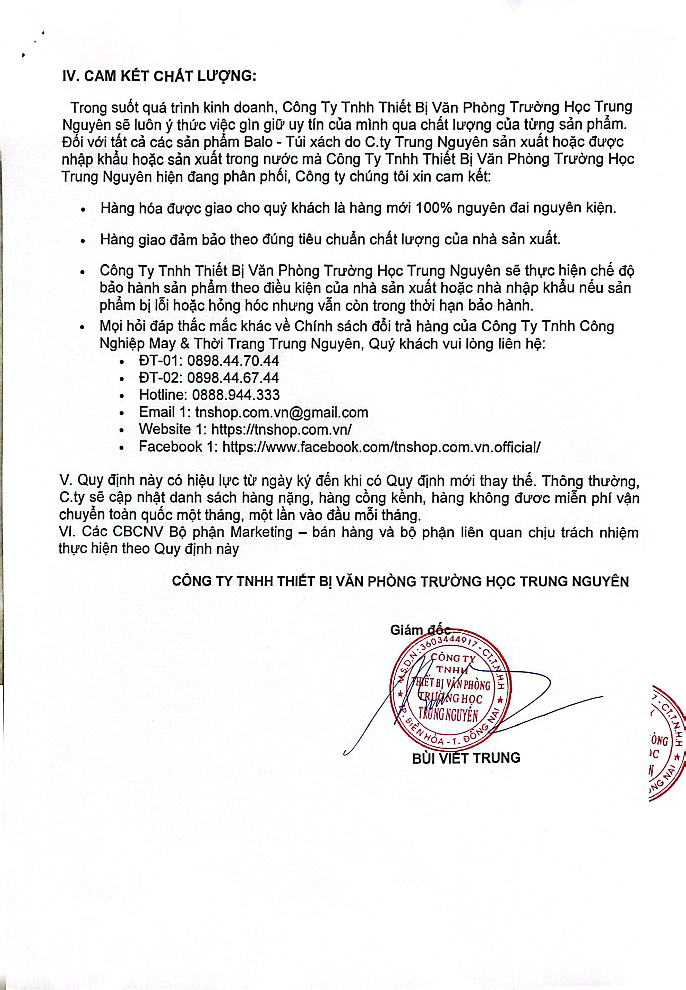 Đối với tất cả các sản phẩm Balo - Túi xách do C.ty Trung Nguyên sản xuất hoặc được nhập khẩu hoặc sản xuất trong nước mà Công Ty Tnhh Thiết Bị Văn Phòng Trường Học Trung Nguyên hiện đang phân phối, Công ty chúng tôi xin cam kết: