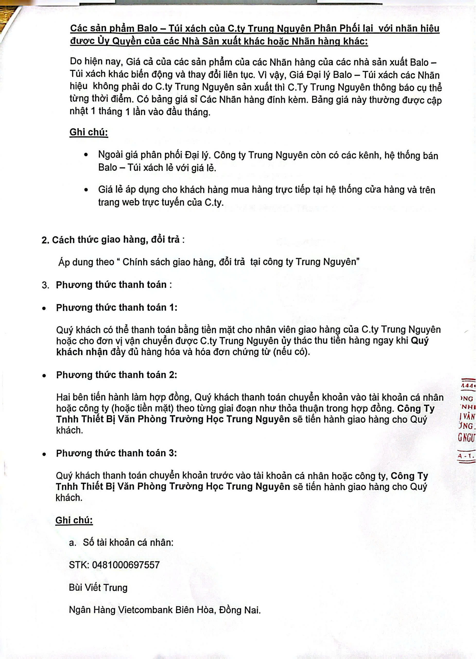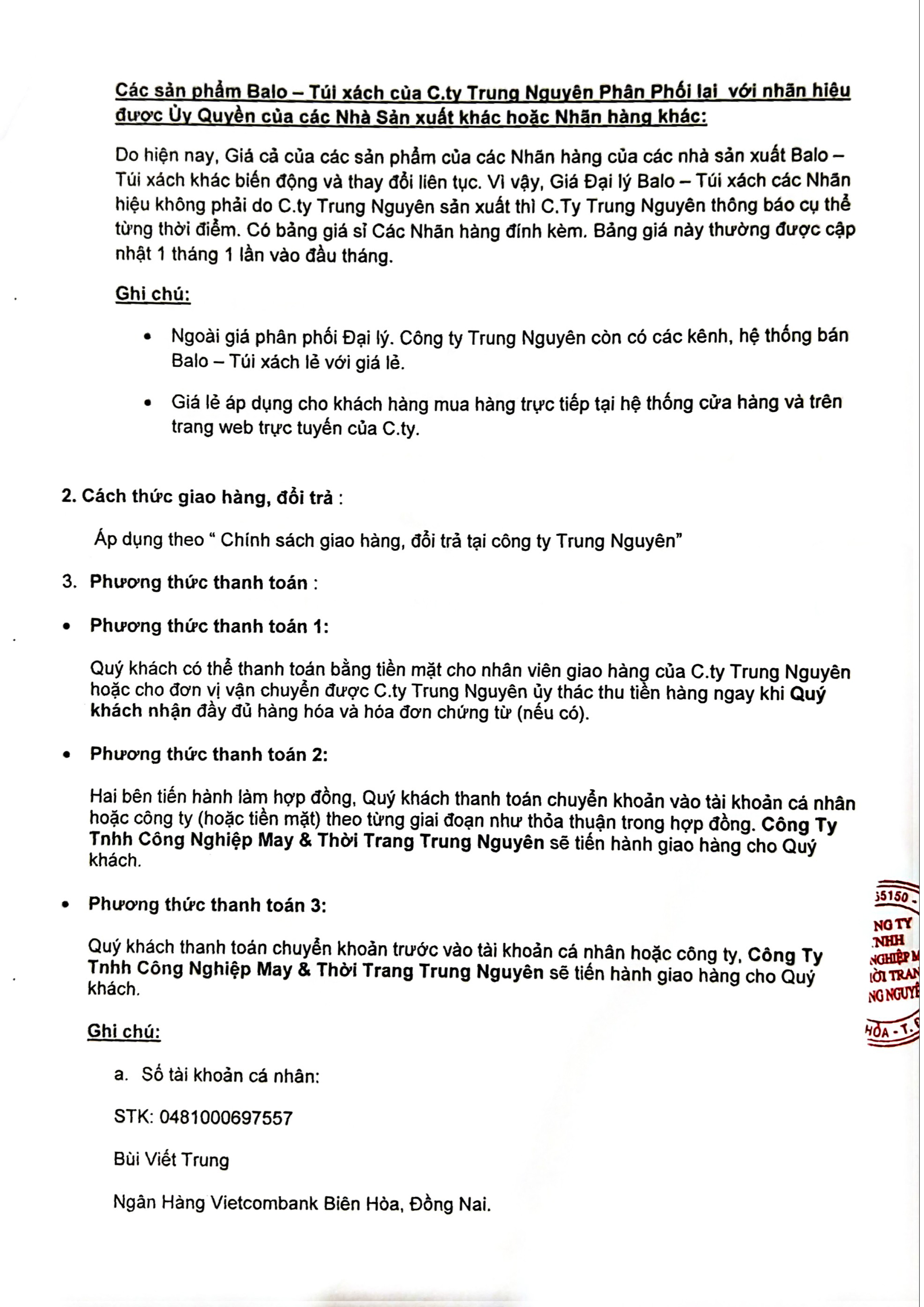 - Ngoài giá phân phối Đại lý. Công ty Trung Nguyên cò có các kênh, hệ thống bán Balo – Túi xách lẻ với giá lẻ.