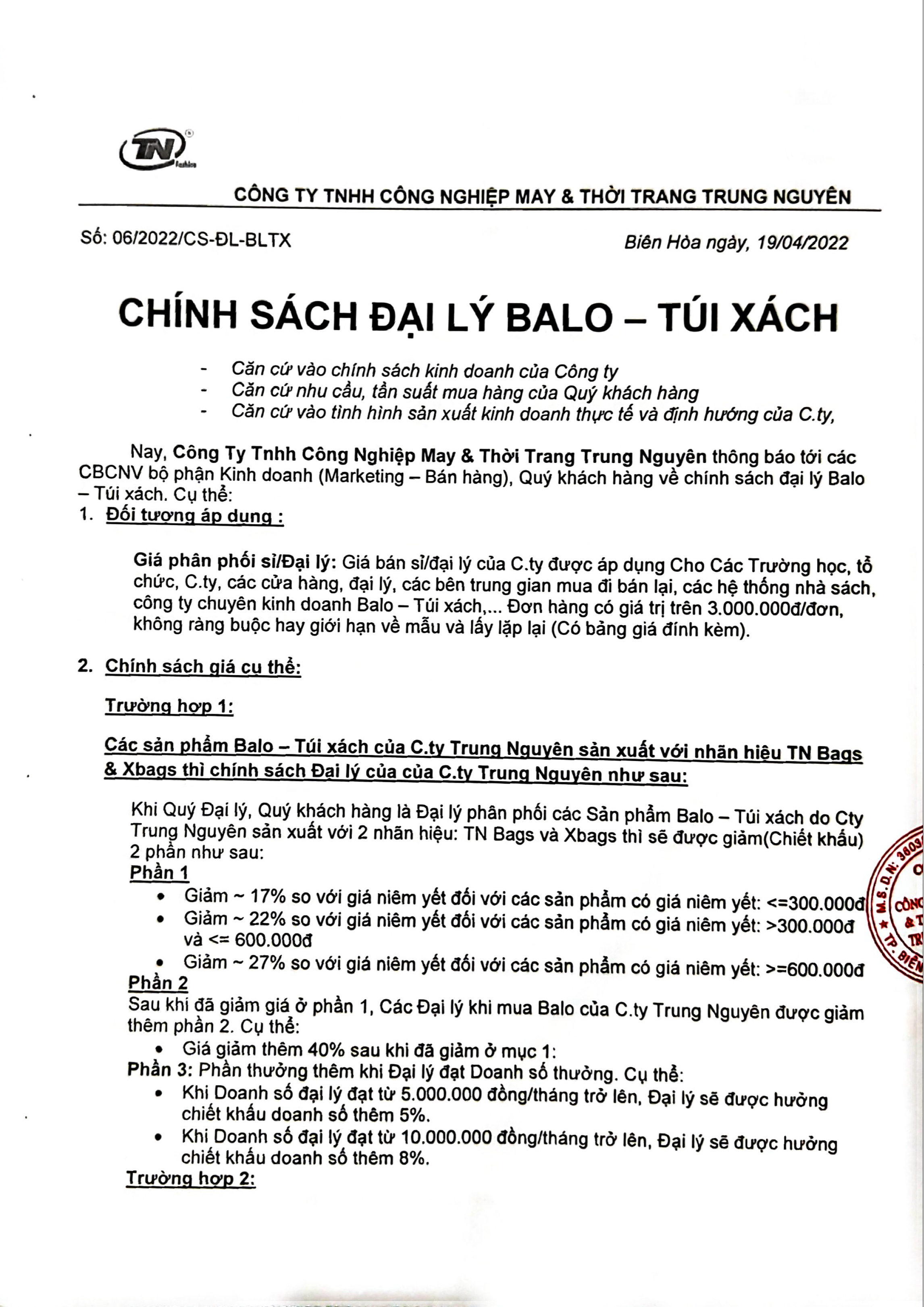 Các sản phẩm Balo – Túi xách của C.ty Trung Nguyên sản xuất với nhãn hiệu TN Bags & Xbags thì chính sách Đại lý của của C.ty Trung Nguyên như sau: