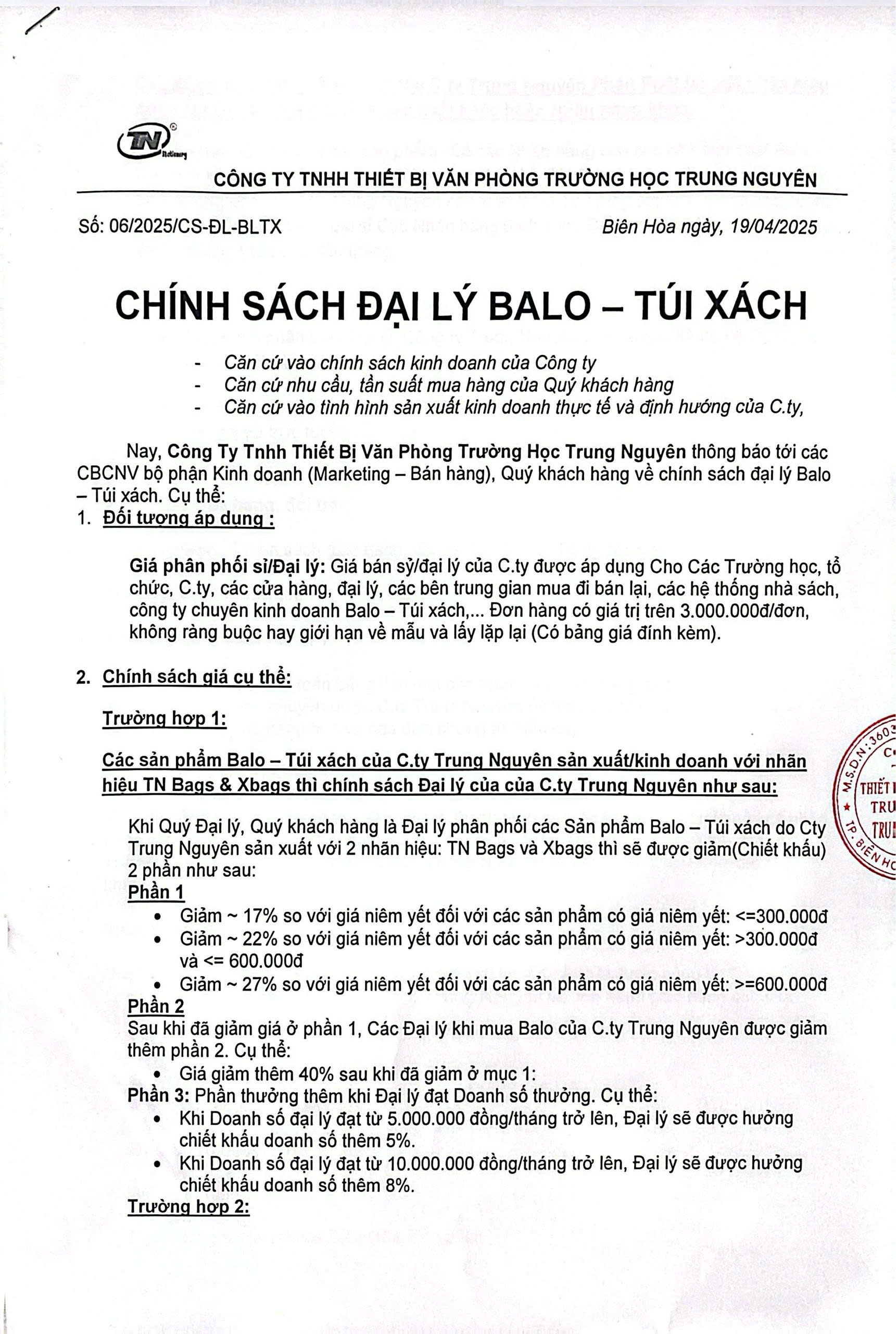 Các sản phẩm Balo – Túi xách của C.ty Trung Nguyên sản xuất với nhãn hiệu TN Bags & Xbags thì chính sách Đại lý của của C.ty Trung Nguyên như sau: