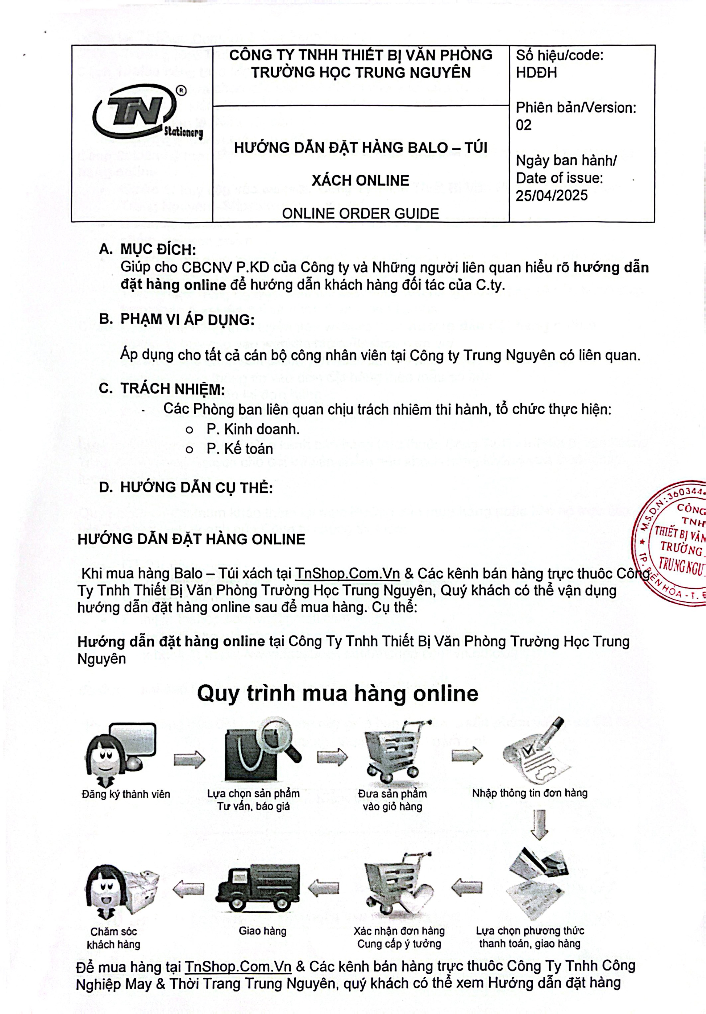 Khi mua hàng Balo – Túi xách tại tnshop.com.vn & Các kênh bán hàng trực thuôc Công Ty Tnhh Công Nghiệp May & Thời Trang Trung Nguyên, Quý khách có thể vận dụng hướng dẫn đặt hàng online sau để mua hàng. Cụ thể: