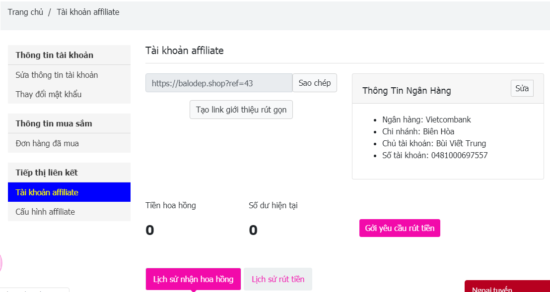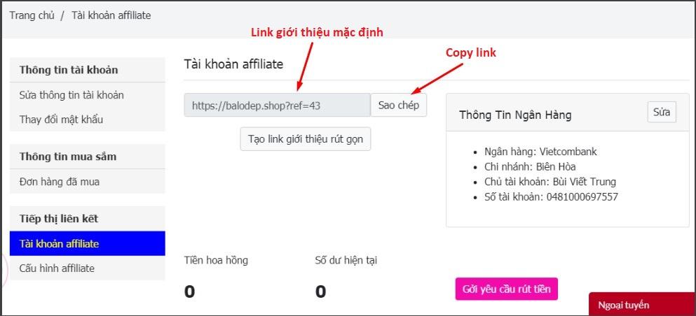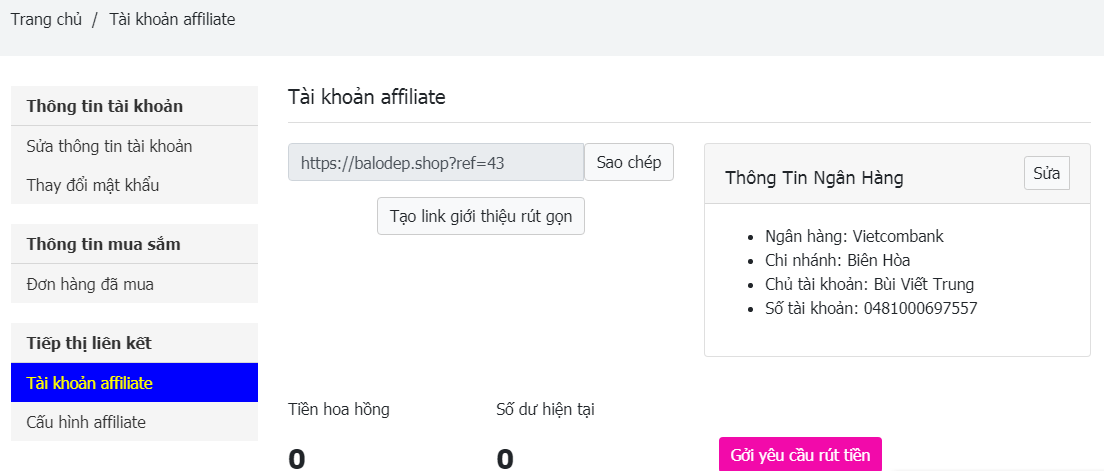 Khi người dùng đã tích số tiền hoa hồng vượt số tiền tối thiểu (chỉ có admin mới xem và thiết lập số tiền tối thiểu) thì có thể rút tiền với số tiền mong muốn.