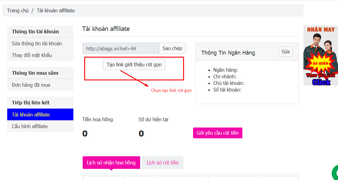 Sau khi tài khoản được duyệt thành công, CTV vào mục Affiliate như hình sau