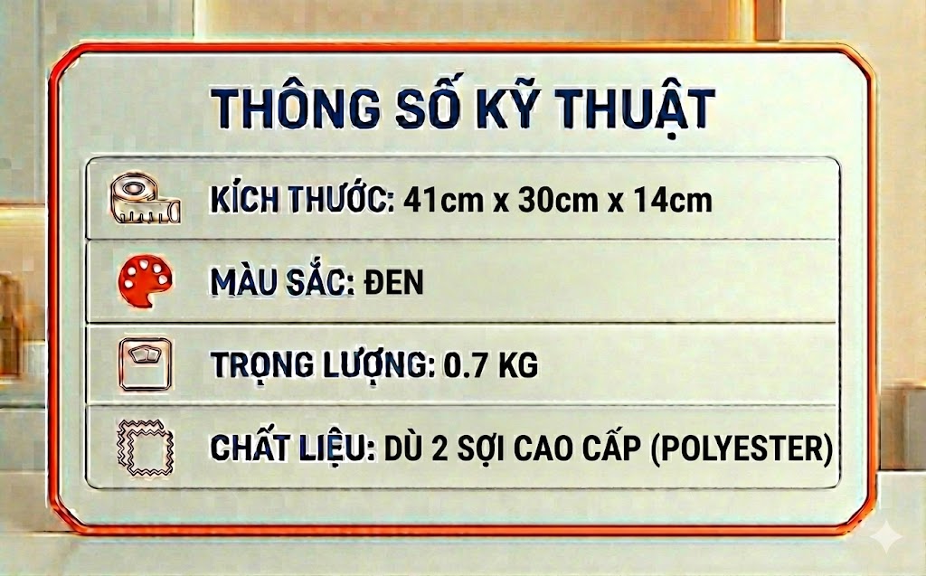 Sản phẩm có kích thước 41 x 30 x 14cm, được thiết kế thành nhiều ngăn kết hợp các ngăn phụ nhỏ phía trước và hai bên hông rất tiện lợi. Ngoài đựng laptop, thiết bị điện tử thì bạn có thể đựng các đồ dùng khác như sách vở, bút viết, điện thoại, tư trang cá nhân,...