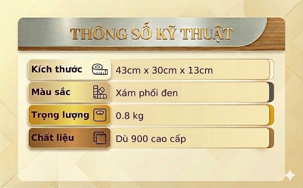 Sản phẩm có kích thước 43 x 30 x 13cm, có ngăn chứa laptop phù hợp cho thiết bị lên đến 15.6 inch, đảm bảo sự an toàn cho laptop nhờ lớp đệm dày chống sốc.