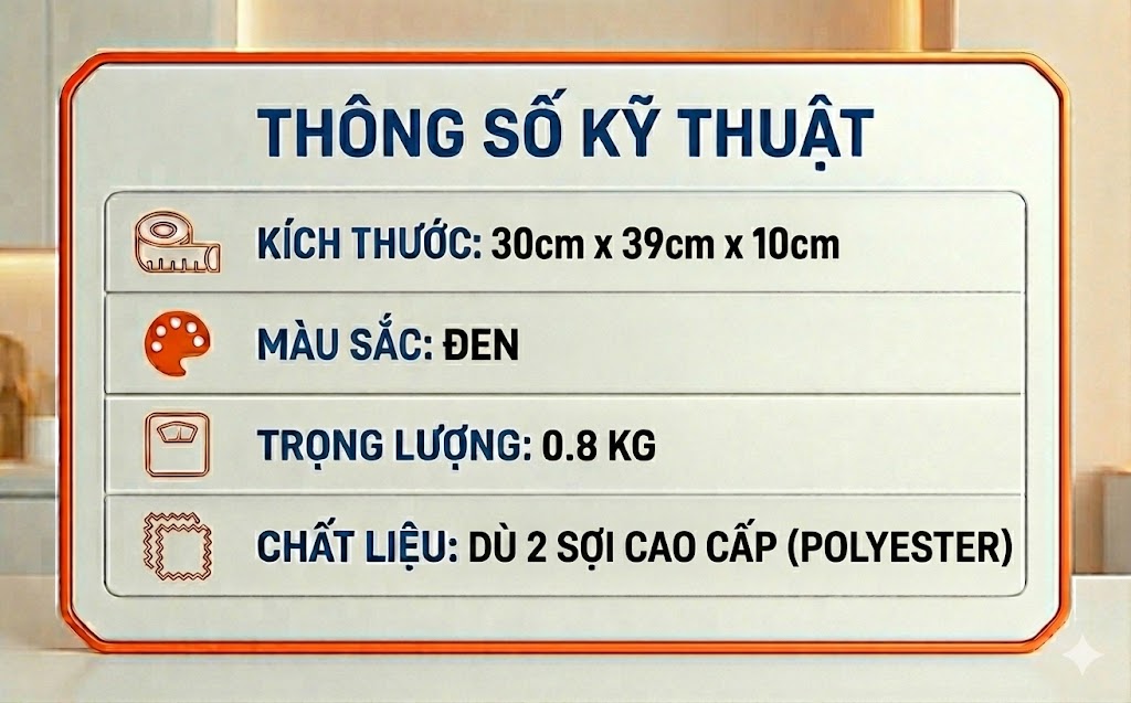 Sản phẩm có kích thước chuẩn 30 x 39 x 10cm, có thiết kế thông minh, ngăn chính rộng rãi có ngăn chống sốc đựng laptop kết hợp với nhiều ngăn phụ nhỏ, cho phép người dùng dễ dàng tổ chức và lưu trữ các phụ kiện như sạc, chuột, điện thoại, và tài liệu quan trọng khác.