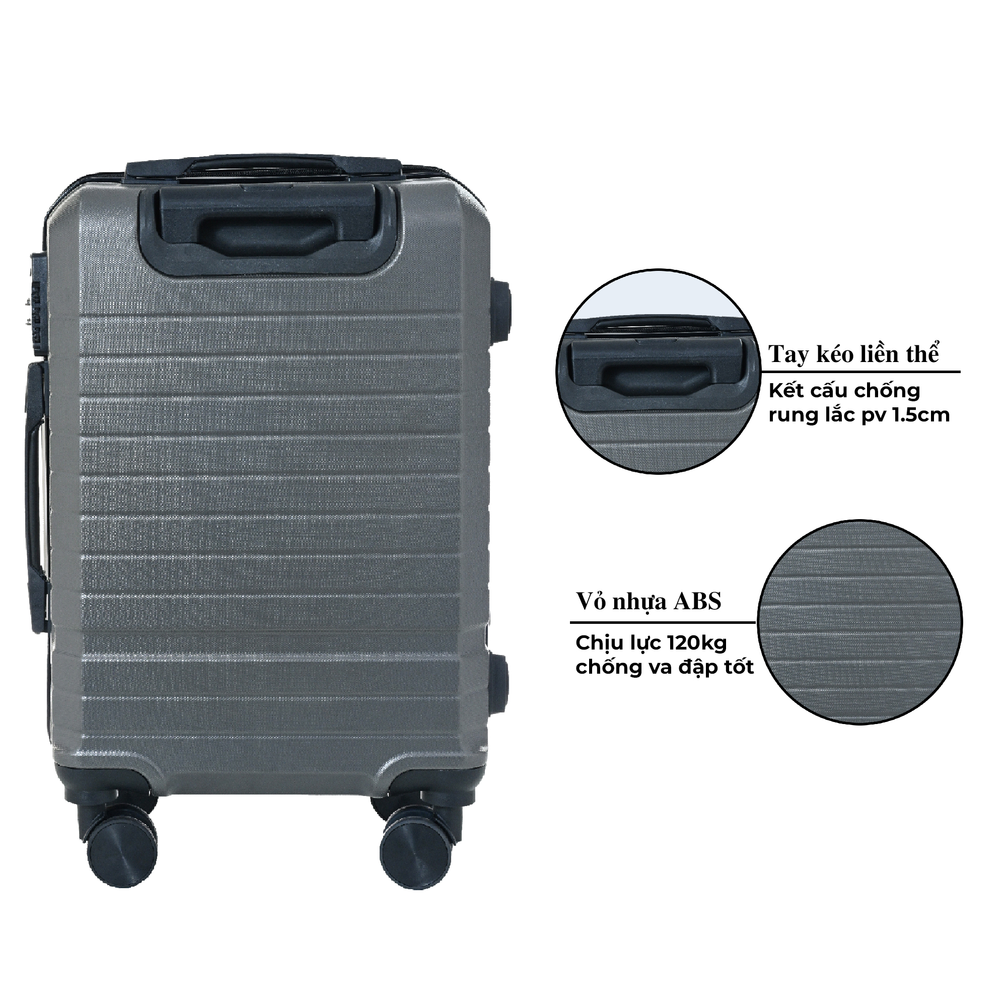 Vali kéo được thiết kế theo phong cách hình khối đơn giản, tạo điểm nhấn với các đường vân 3D song song chạy ngang thân vali, kết hợp với màu xám mang kiểu dáng vừa đơn giản nhưng không kém phần sang trọng.